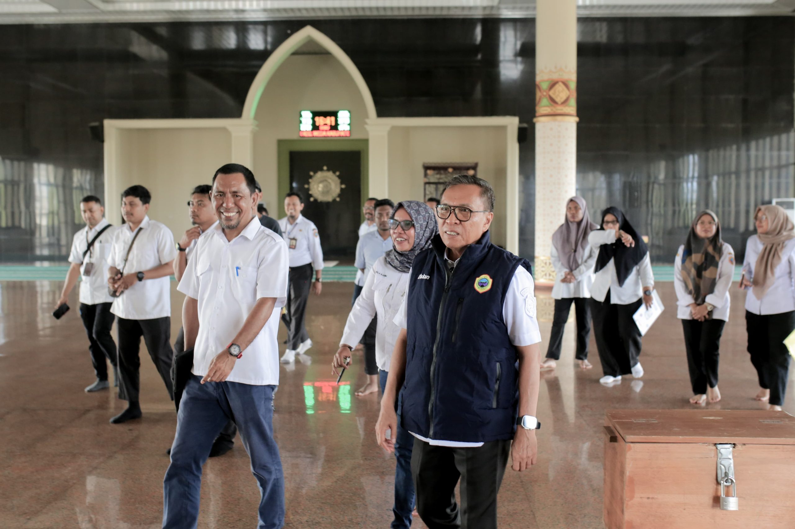 Setelah itu, Bupati berlanjut untuk mengecek kondisi Masjid Raya Weda. Selama pemeriksaan, ditemukan beberapa poin yang memerlukan perbaikan segera, seperti adanya kebocoran pada bagian atap, penataan lansekap dan teras yang perlu disusun ulang, kerusakan pada pintu utama, serta kondisi keramik teras yang sudah tidak rata. “Masjid Raya adalah rumah ibadah yang menjadi pusat kegiatan keagamaan masyarakat, sehingga harus tetap terjaga kebersihan dan kenyamanannya,” ujar Bupati Ikram.