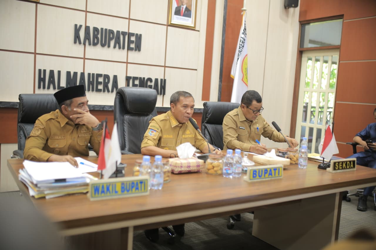 WEDA — Bupati Halmahera Tengah menggelar rapat bersama pimpinan Organisasi Perangkat Daerah (OPD) se-Kabupaten, didampingi Wakil Bupati dan Sekretaris Daerah. Rapat yang berlangsung di ruang rapat Bupati dihadiri juga oleh Staf Ahli, para Asisten, serta seluruh pimpinan OPD, dengan fokus utama pada penguatan disiplin aparatur dan percepatan pelaksanaan program prioritas demi kesejahteraan masyarakat.